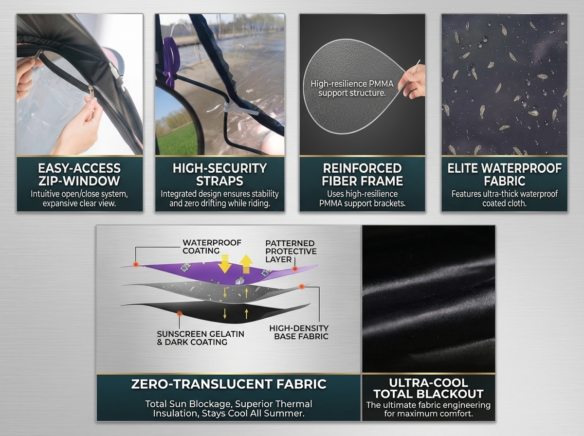 | Protection Range | Sunshade, rainproof, and windproof (Universal for all seasons) |